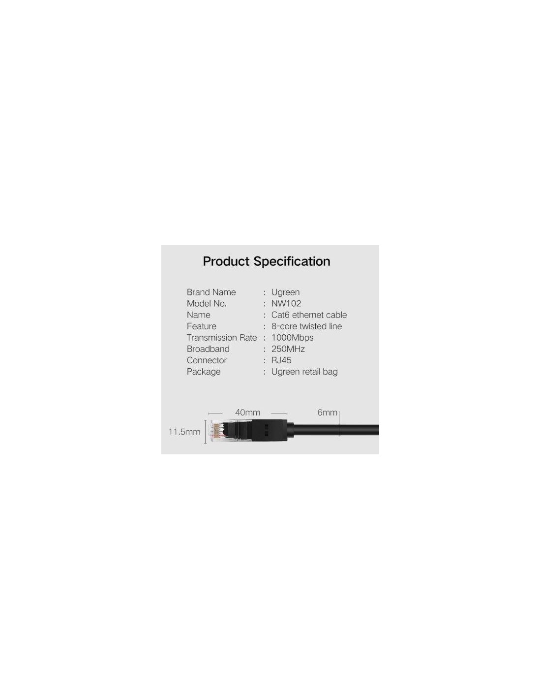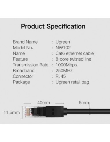 Ugreen Cat6 UTP LAN mrežni kabel dolžina 1m. Za priklop sta na voljo 2 RJ45 moška konektorja z visoko kvalitetnim PVC ovojem.RJ45 Cat 6 UTP Ethernet kabel, zasnovan za navzkrižne povezave med računalnikom in stikalom, usmerjevalnikom ali naročniško vtičnico.
