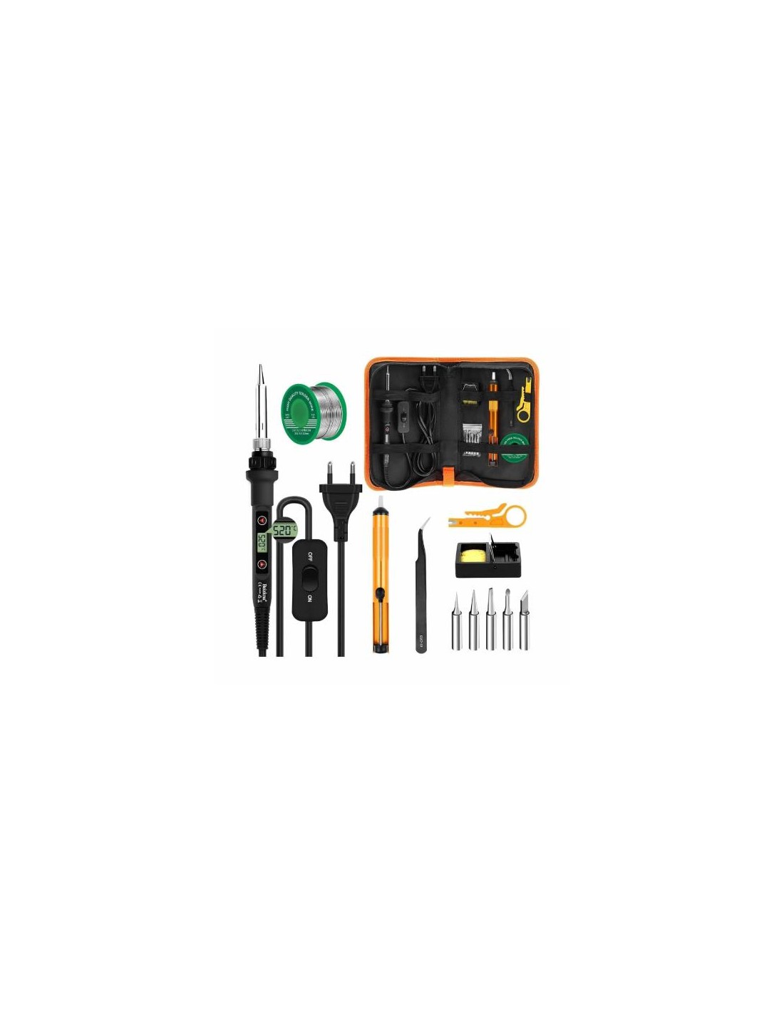 Paket vsebuje: 1x 80 W spajkalnik z nastavljivo temperaturo, 5x različne spajkalne konice, 1x črpalka za odspajkanje, 1x 50g spajkalne žice s kolofonijevim jedrom, 1x stojalo za spajkalnik izolacije, 1x antistatična pinceta, 1x torbica iz PU usnja, 1x uporabniški priročnik, 1x navodila