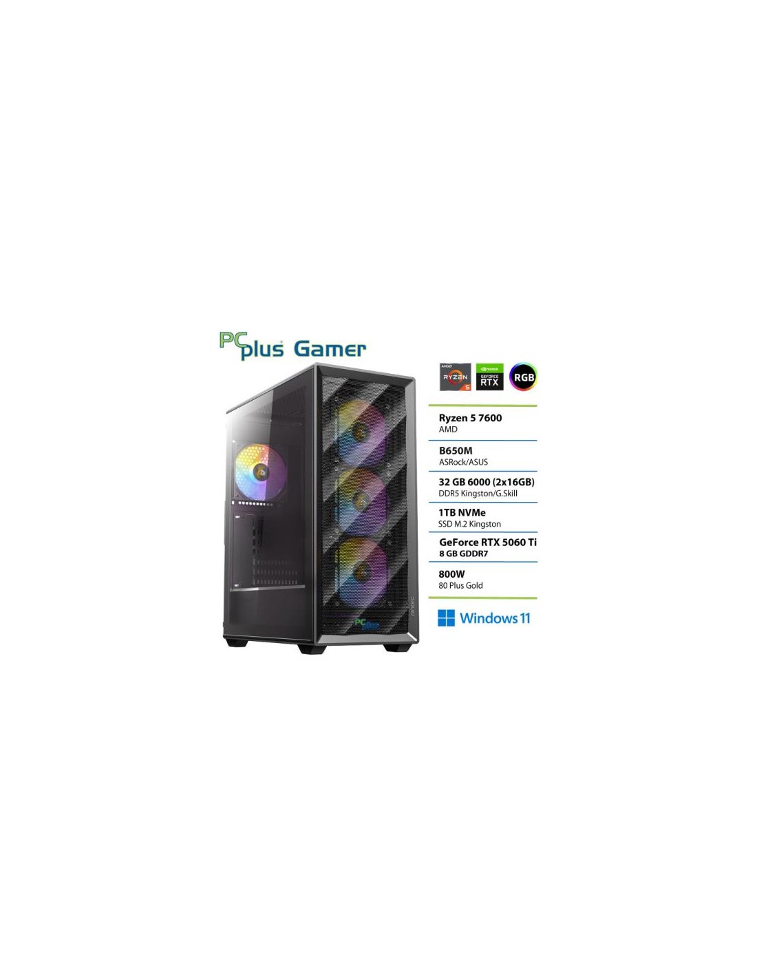 PCPLUS Gamer Ryzen 5 7600 32GB 1TB GeForce RTX 5060 Ti 8GB Windows 11 Home gaming namizni računalnik