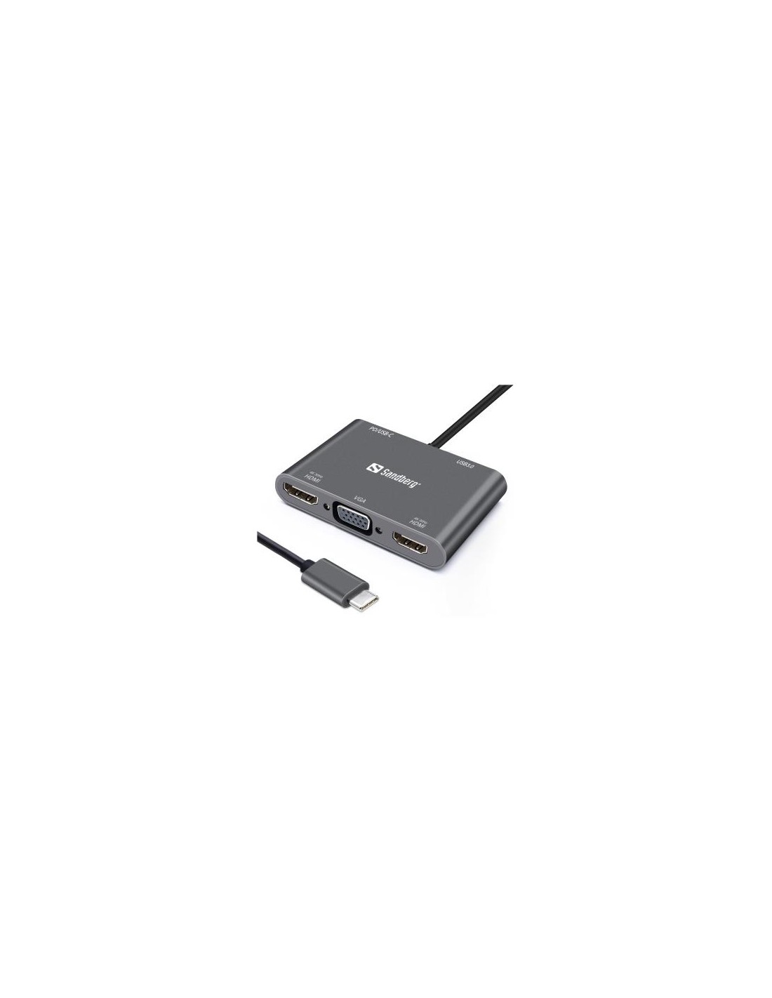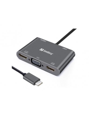 S Sandberg USB-C Dock 2xHDMI+1xVGA+USB+PD priklopno postajo za več monitorjev z vhodom USB-C lahko zlahka priključite dva dodatna monitorja preko kabla HDMI ali en monitor preko HDMI ter enega preko VGA. Priklopna postaja ima tudi tradicionalni vhod USB-A za npr. miško ali zunanji disk, ter napajalnik USB-C PD za dodatno napajanje vašega prenosnika.