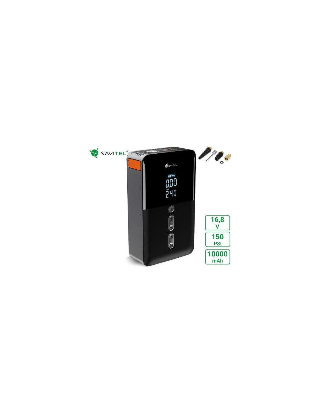 NAVITEL AIR 30 MULTI je elegantna prenosna brezžična zračna tlačilka z avtomatskim regulatorjem tlaka, digitalnim merilnikom pritiska in LCD zaslonom. Gre za večnamensko napravo, ki lahko napolni pnevmatike, polni mobilne naprave in celo zažene avtomobile s praznimi akumulatorji. Zahvaljujoč vgrajeni polnilni bateriji s kapaciteto 10000 mAh, tlačilka deluje povsem brezžično in brez priklopa na električno vtičnico ali omrežje v vozilu.