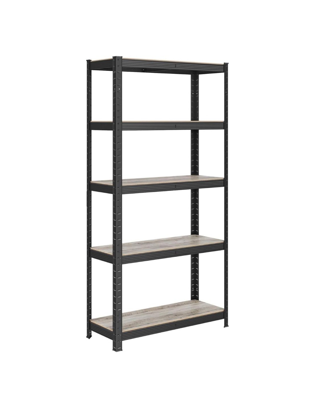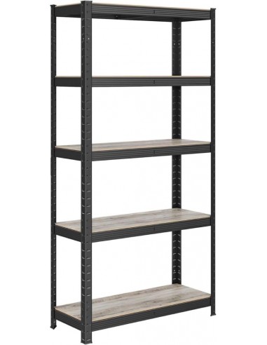 Podrobnosti o izdelku:Barva: naravna črnaMaterial: prašno lakirano jeklo, MDF (vlaknena plošča srednje gostote)Velikost posamezne police: 150 x 75 x 30 cm (v x d x š)Teža posamezne police: 8,1 kgMaksimalna statična nosilnost posamezne police: 80 kg