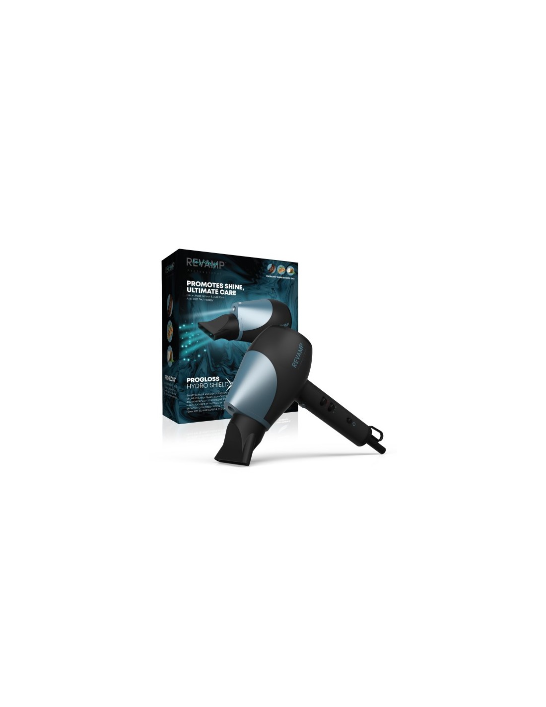 Poskrbite za svoje lase in zamenjajte sušilnik za lase z Revamp Progloss™ Hydro Shield X Shine sušilnikom za lase. Ta sušilec za lase je inovativna dopolnitev linije Revamp, katerega bistvo je skrb za lase. Sušilnik je opremljen s pametnim senzorjem, ki spremlja temperaturo zračnega toka, in po potrebi prilagaja toploto, da prepreči nepotrebne poškodbe in hkrati ščiti naravno vlago las. Precej intelegentno, če lahko tako rečemo - vendar se napredna tehnologija ne zaključi pri tem. Ta sušilnik za lase ima pozitivne in negativne ionske tokove, zato bo poskrbel, da se lasje med oblikovanjem ne bodo razmršeni, saj bo poskrbel za njihovo nego. S štirimi nastavitvami toplote in tremi nastavitvami hitrosti (vključno s hladnim načinom) lahko popolnoma nadzorujete sušenje in oblikovanje. Rešetka, prepojena s Progloss™ tretmajem keratina, arganovega in kokosovega olja, obljublja gladke, sijajne in bleščeče lase, ki si jih boste želeli vedno znova. Ta sušilnik za lase ima dve koncentrirni šobi, difuzor za lepše oblikovane kodre, in snemljiv zadnji filter, ki ga je mogoče enostavno očistiti.