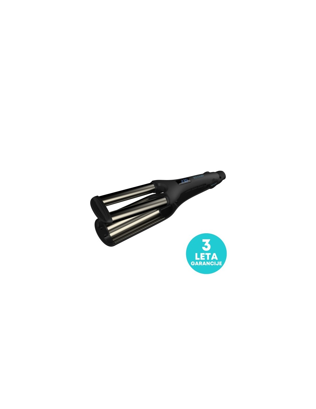 - Keramični in ionski trojni valji premera 19 mm z zasnovo, ki ne pušča gub na laseh, za gladke valove v obliki črke S